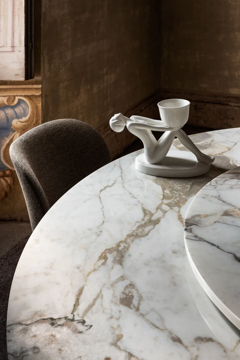 Круглый мраморный стол разработан с вниманием к деталям, с устойчивым основанием, которое обеспечивает безопасность и долговечность. Используемые материалы устойчивы к царапинам и пятнам, что облегчает уход за ним. Размеры стола тщательно продуманы, чтобы удобно вписываться в различные кухонные пространства, предлагая универсальность в размещении и использовании.