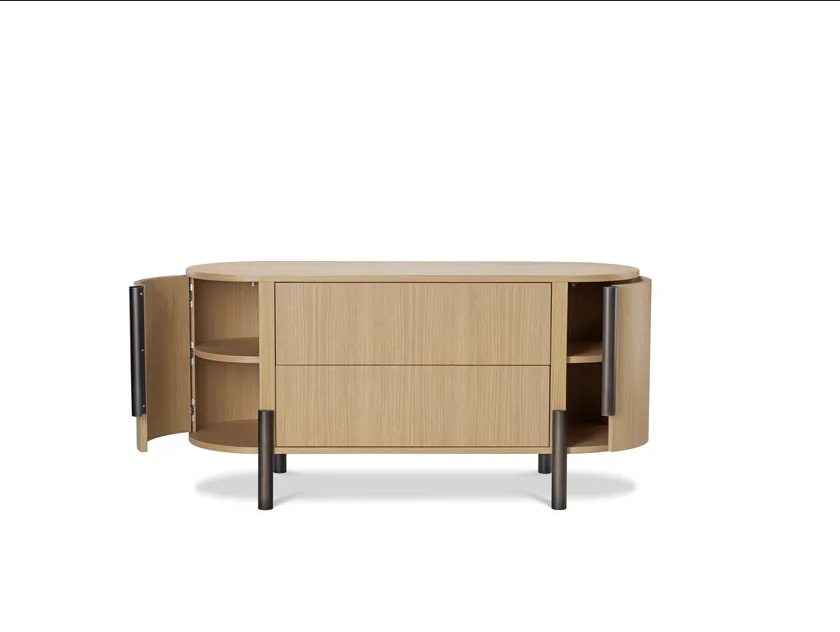 Этот изысканный комод изготовлен из высококачественного дуба, что обеспечивает долговечность и долговечность. Натуральная отделка подчеркивает богатую текстуру дерева, сохраняя при этом экологически чистый подход. Алюминиевые цилиндрические элементы служат как стильные ручки, так и прочные ножки, добавляя современный штрих. Все материалы получены от устойчивых поставщиков и соответствуют международным стандартам экологии, что гарантирует, что вы инвестируете в продукт, который так же ответственный, как и красивый.