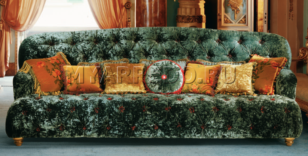 Четырехместный диван BM Style в классическом стиле. Обивка выполнена тканью насыщенного изумрудного цвет. Каркас из массива дерева. Сидение и спинка украшены каретной стяжкой - капитоне. Невысокие прямоугольные подлокотники. Полиуретановое наполнение. Фигурные ножки золотистого цвета. Заказать данный диван можно в других вариантах обивки.