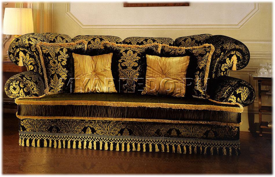 Трехместный диван фабрики BM Style, выполненный с обивкой из жаккардовой ткани с золотистым флористическим орнаментом, который прекрасно смотрится на темном фоне. Широкие, удобные подлокотники. Каркас выполнен из дерева. Сиденье и изножье дивана декорировано бахромой. Полиуретановое наполнение. Данный диван можно заказать в других вариантах обивки.