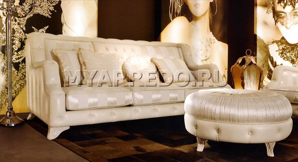 Трехместный диван с резными ножками. Наполнение - полиуретан. Диван может быть укомплектован раскладным механизмом. Минимальный размер двери, в которую может пройти модель - 75 см. Заказать данный диван можно в различных вариантах обивки.