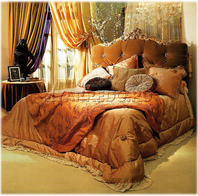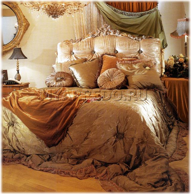 Двуспальная кровать с высоким мягким изголовьем. Изголовье украшено резьбой. Вся отделка ручной работы. Возможны другие варианты обивки и отделки.